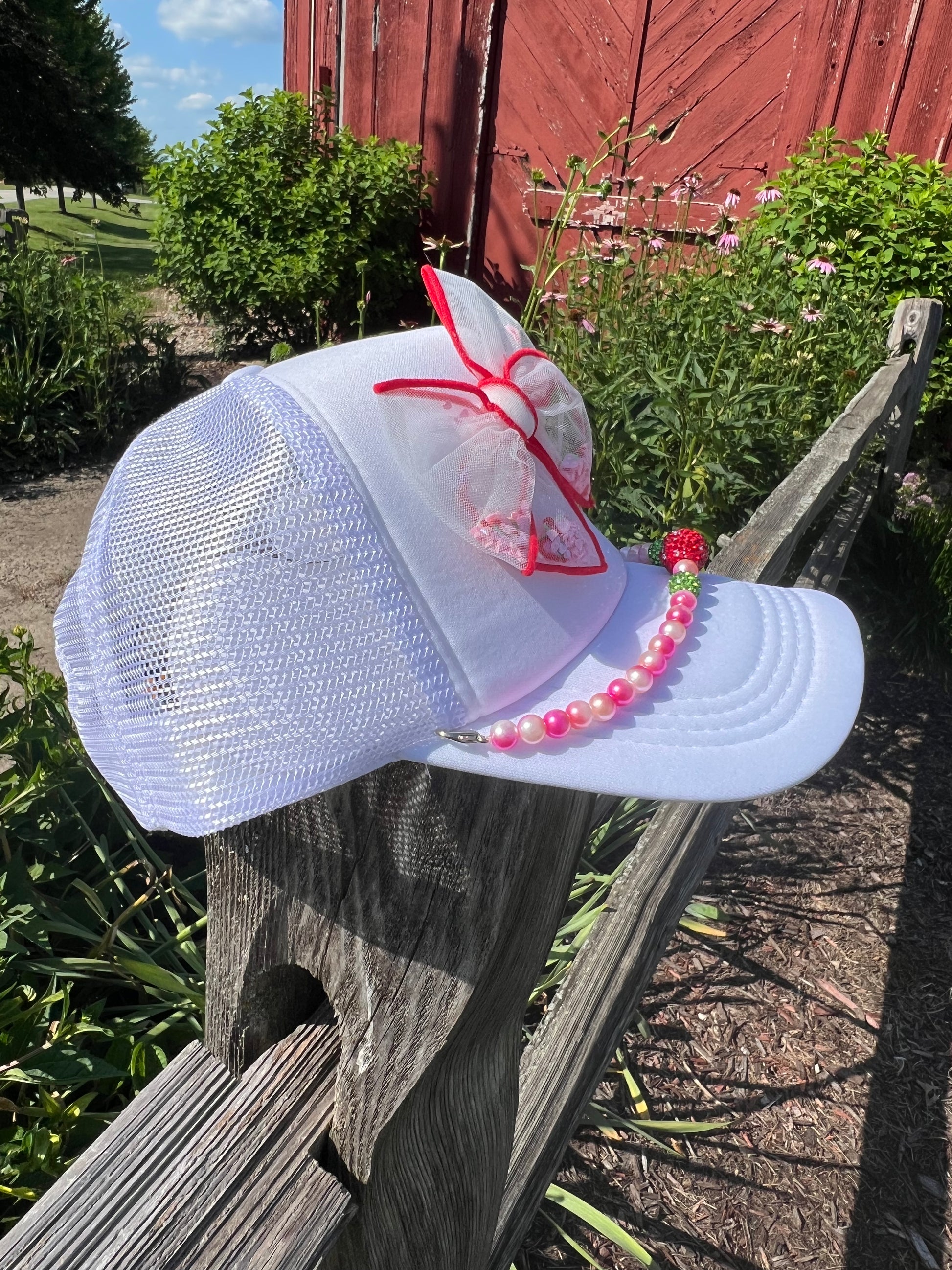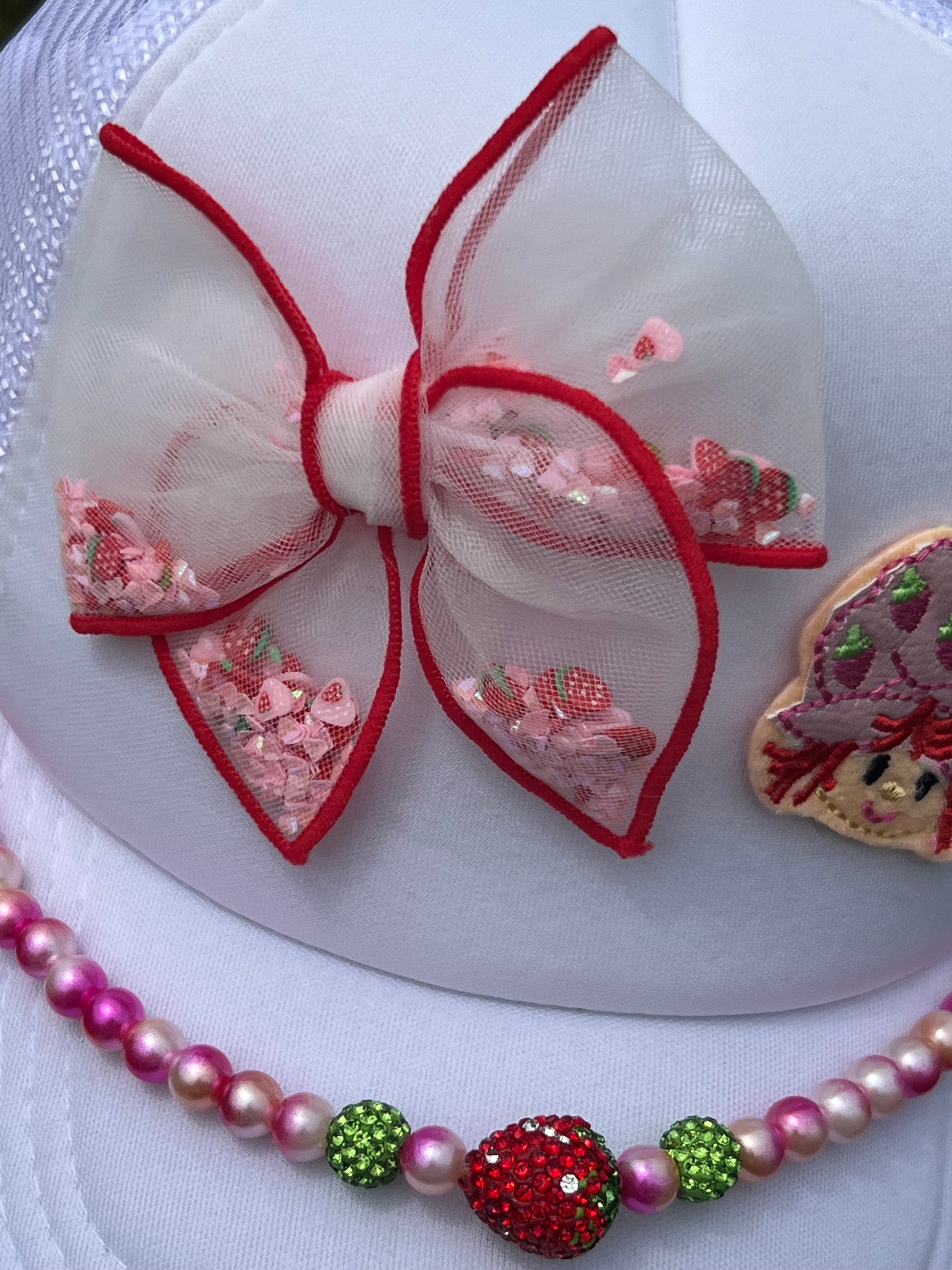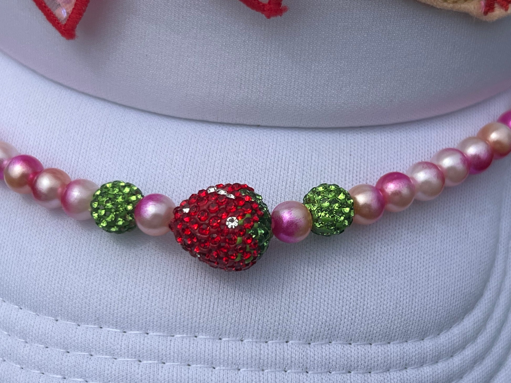 Rock that retro vibe with the Strawberry Fields Trucker Hat—a bold throwback that channels pure 70s energy. This daring piece features an embroidered felt strawberry girl patch, a playful shaker bow adorned with strawberries, and a statement hat chain strung with delicate pink pearls and a crystal strawberry charm. The adjustable snap back closure ensures the perfect fit every time. Whether you're channeling disco fever or making a nostalgic fashion statement, this trucker hat delivers vintage attitude with modern edge.