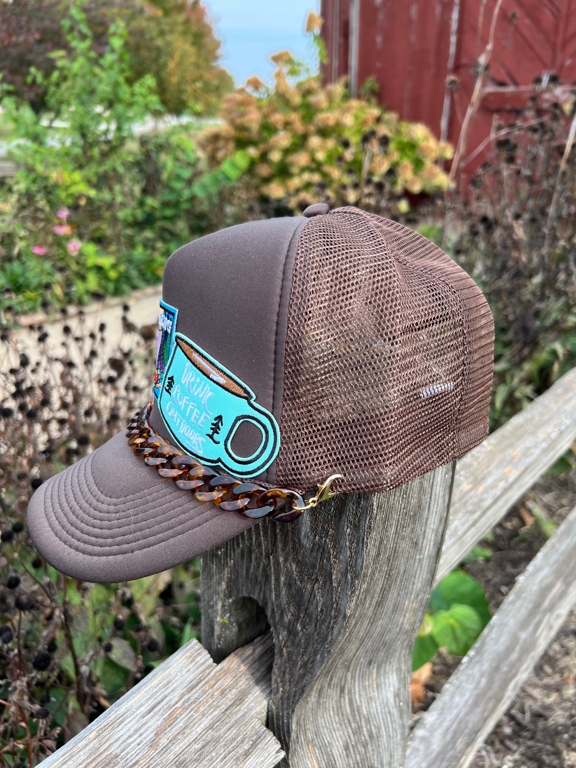 Own your story with this brown trucker hat that refuses to fade into the background. Embroidered patches showcase your devotion to camping, hiking, and coffee— the essentials that fuel your adventures. A tortoise hat chain adds grit and character, while the adjustable back closure ensures it stays locked in place. Elegantly minimal yet undeniably fierce, this hat speaks for those brave enough to live authentically.